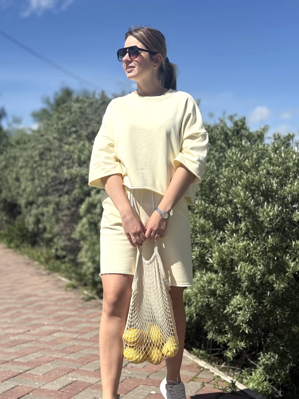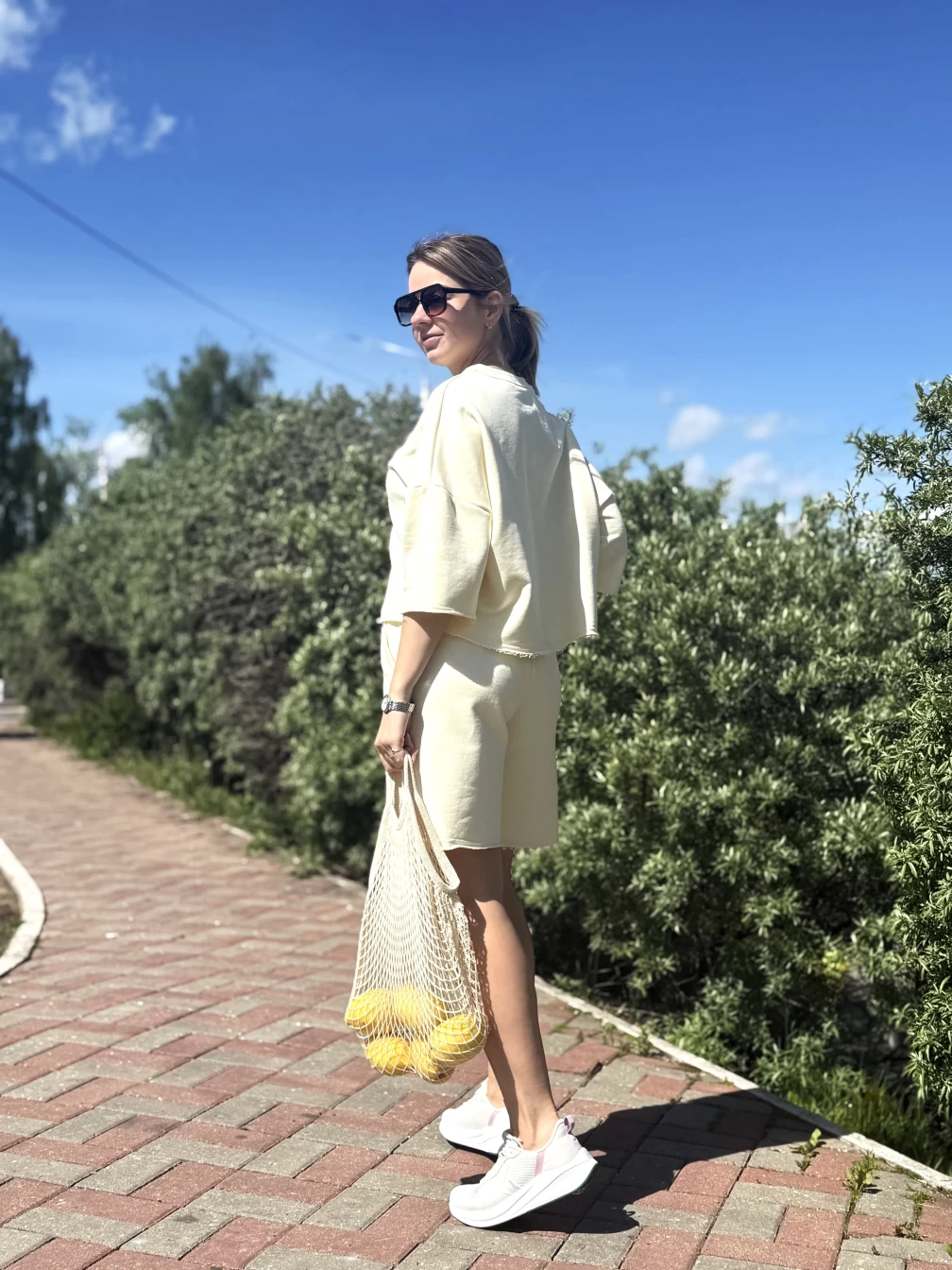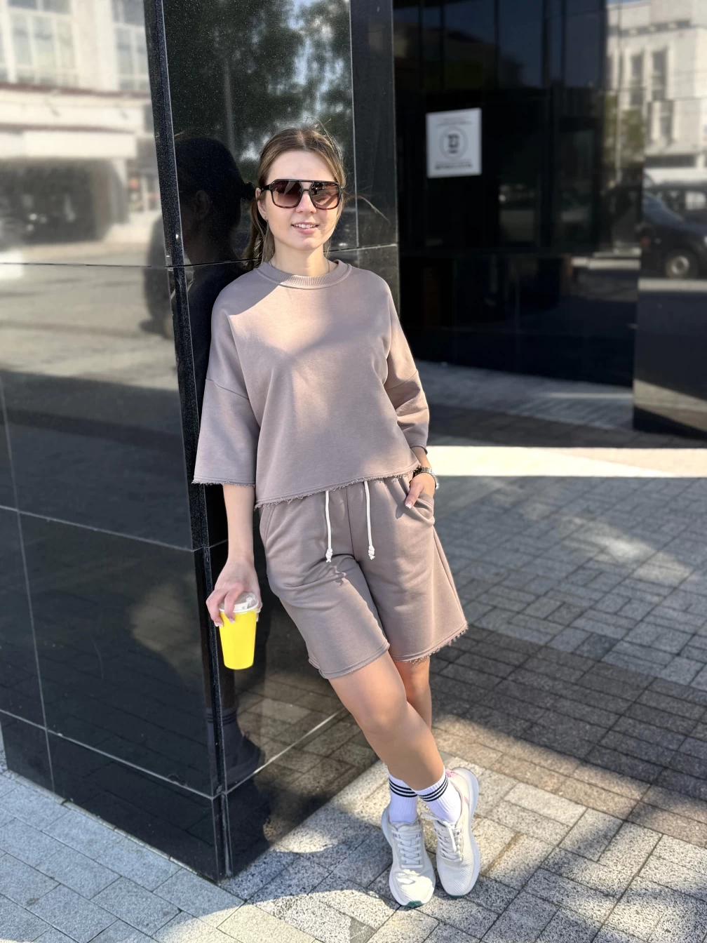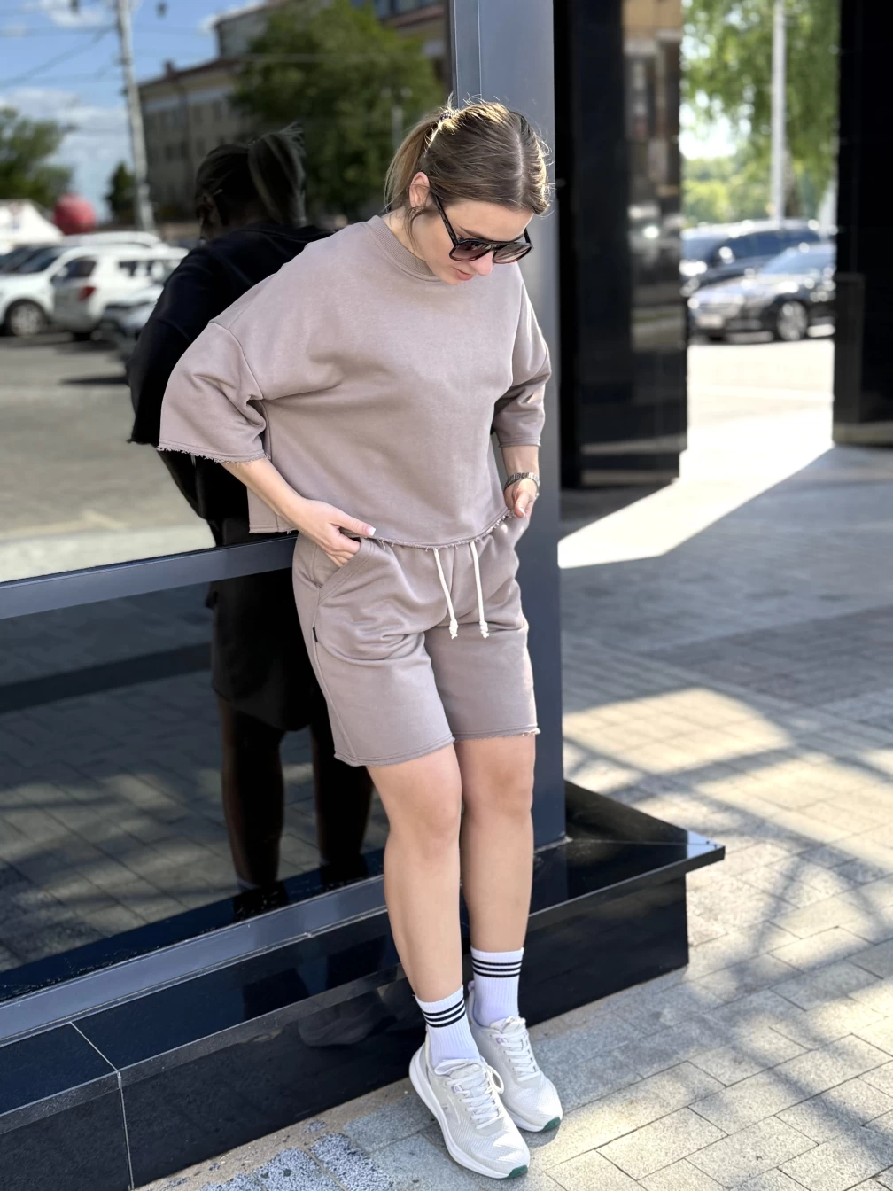 Современный трикотажный комплект, идеально подходящий для отдыха, прогулок и повседневной носки. В состав входит укороченная футболка в стиле оверсайз и шорты средней длины со свободной посадкой. Оба изделия выполнены в едином стиле и образуют гармоничный комплект. Футболка отличается спущенной линией плеча и сырым срезом по низу и рукавам, что придаёт образу расслабленность и актуальность. Горловина оформлена довязом, обеспечивающим аккуратную посадку и долговечность формы. Шорты дополнены эластичным поясом на резинке и регулирующим шнурком. Наличие боковых карманов делает модель удобной в повседневной носке. Сырой срез по низу шорт визуально перекликается с отделкой футболки и завершает целостный образ. Комплект не требует дополнительной стилизации и подходит для носки как дома, так и на улице.