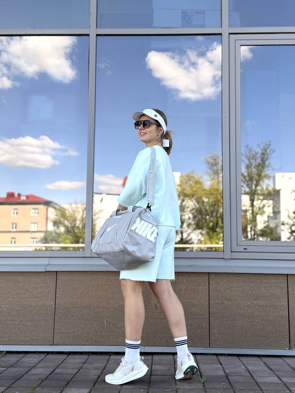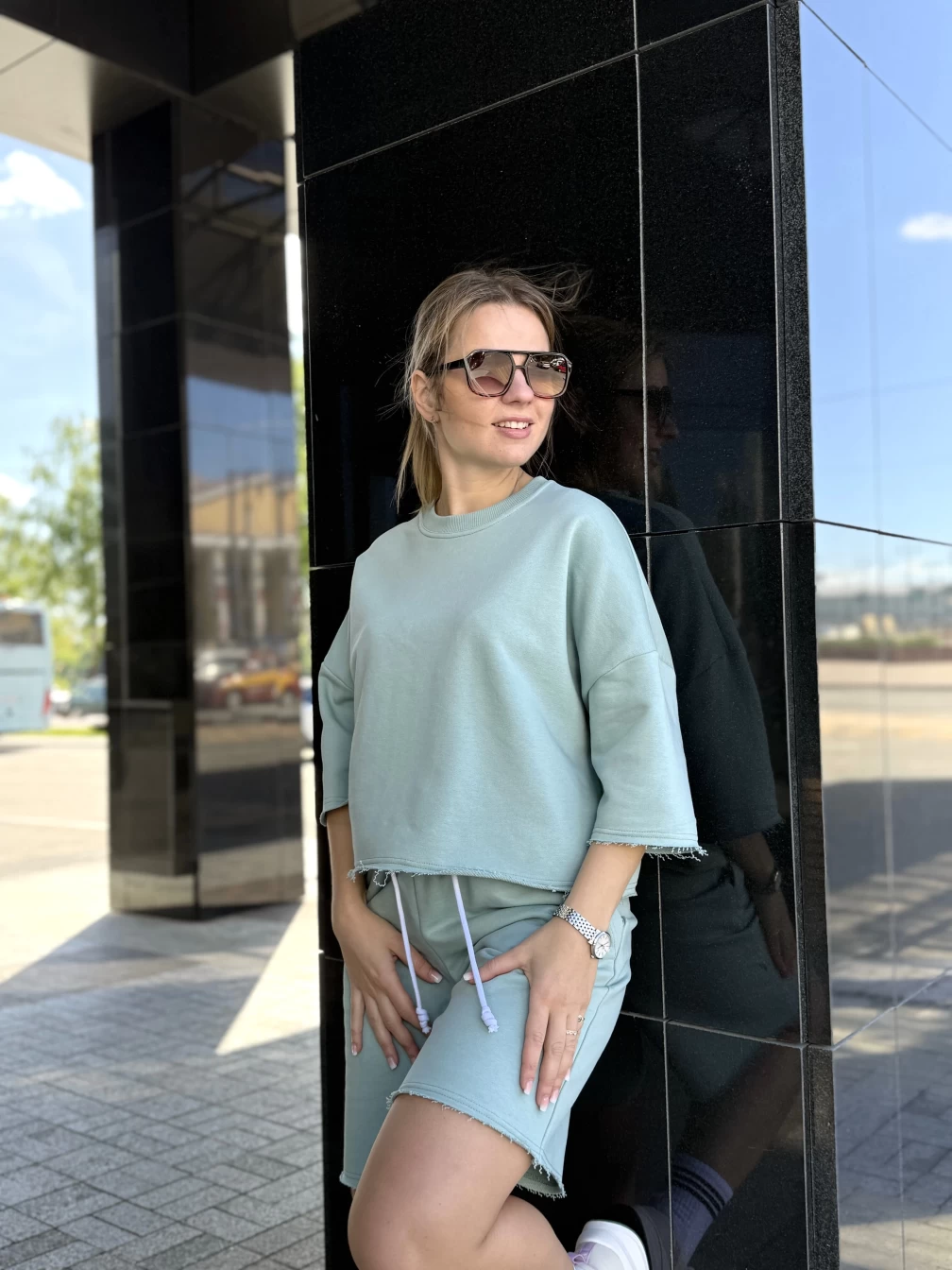 Современный трикотажный комплект с бархатным эффектом, идеально подходящий для отдыха, прогулок и повседневной носки. В состав входит укороченная футболка в стиле оверсайз и шорты средней длины со свободной посадкой. Оба изделия выполнены в едином стиле и образуют гармоничный комплект. Футболка отличается спущенной линией плеча и сырым срезом по низу и рукавам, что придаёт образу расслабленность и актуальность. Горловина оформлена довязом, обеспечивающим аккуратную посадку и долговечность формы. Шорты дополнены эластичным поясом на резинке и регулирующим шнурком. Наличие боковых карманов делает модель удобной в повседневной носке. Сырой срез по низу шорт визуально перекликается с отделкой футболки и завершает целостный образ. Комплект не требует дополнительной стилизации и подходит для носки как дома, так и на улице.