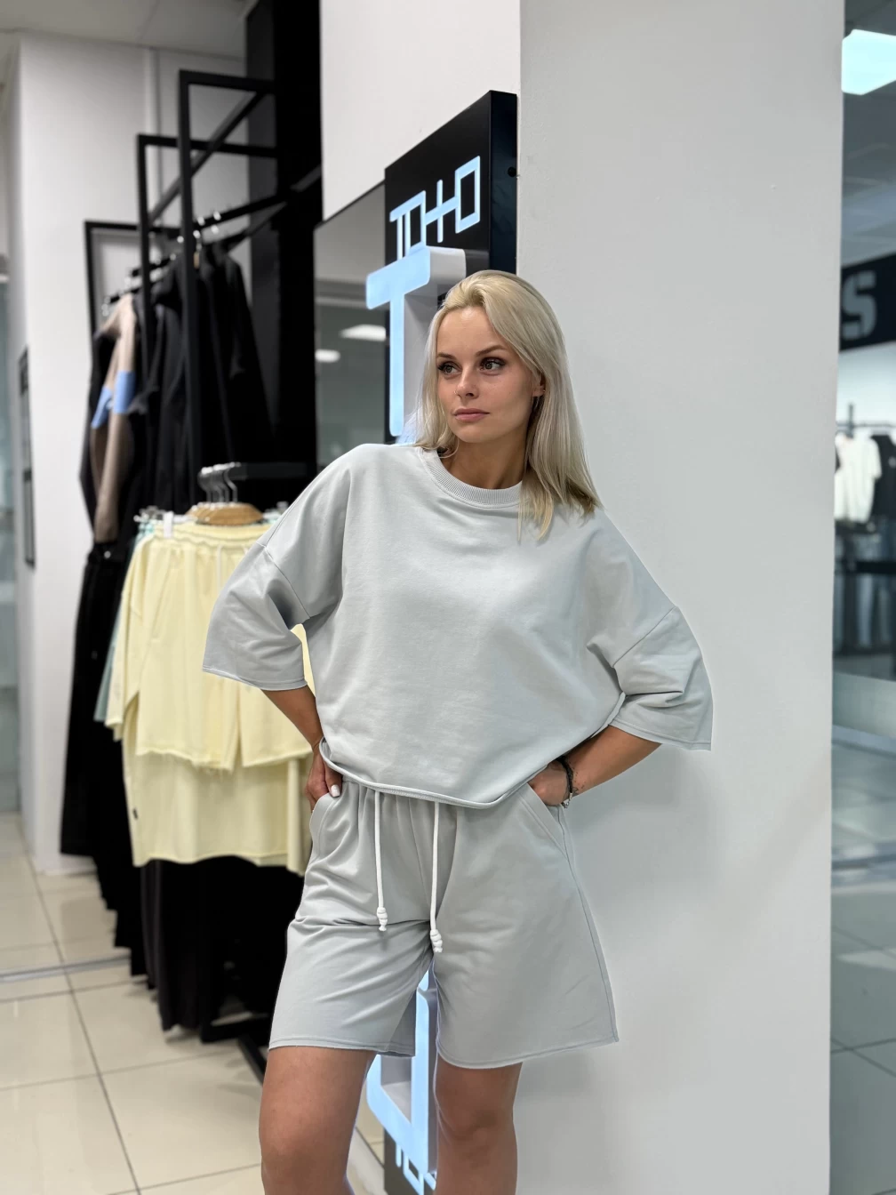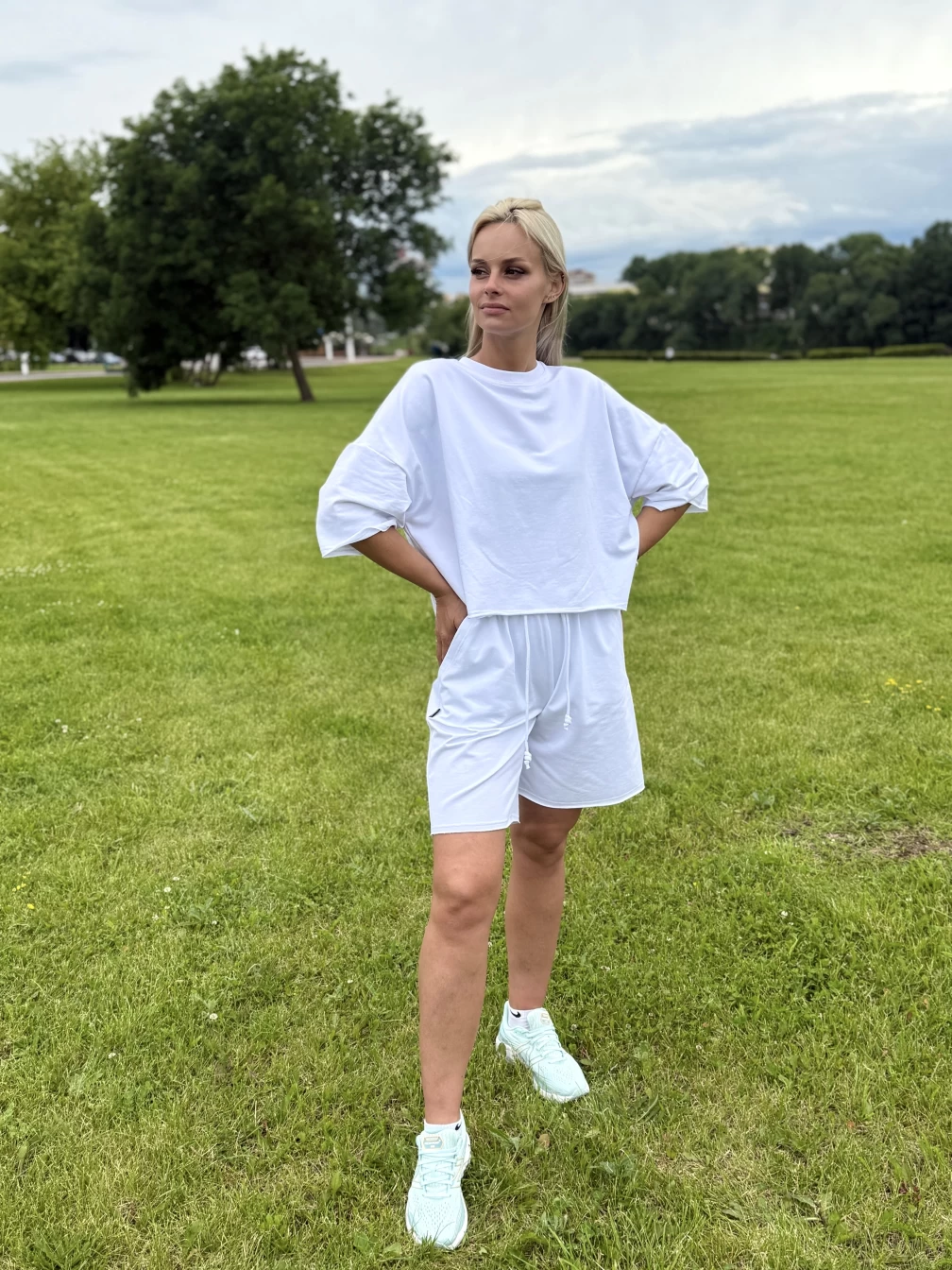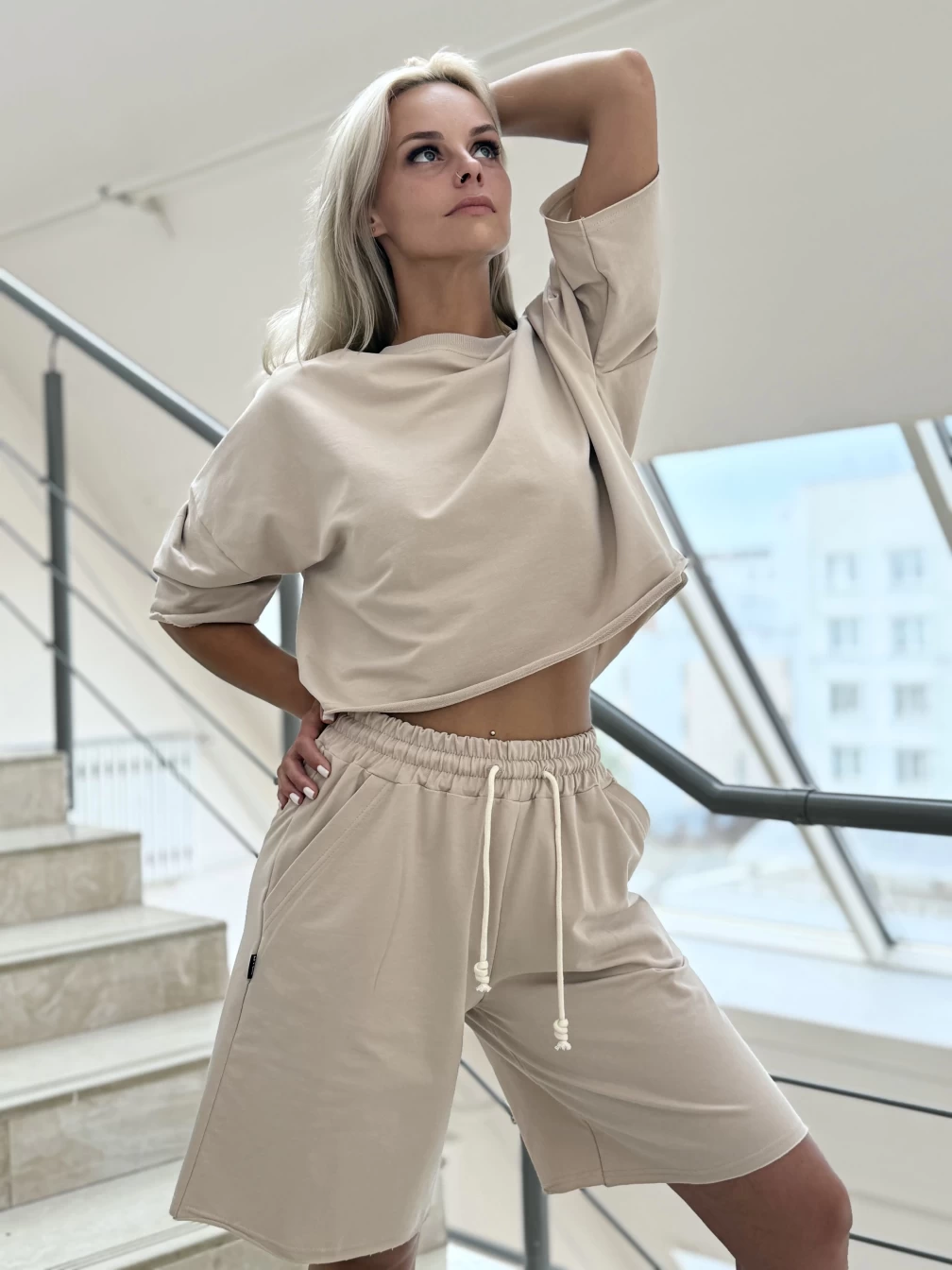 Современный трикотажный комплект, идеально подходящий для отдыха, прогулок и повседневной носки. В состав входит укороченная футболка в стиле оверсайз и шорты средней длины со свободной посадкой. Оба изделия выполнены в едином стиле и образуют гармоничный комплект. Футболка отличается спущенной линией плеча и сырым срезом по низу и рукавам, что придаёт образу расслабленность и актуальность. Горловина оформлена довязом, обеспечивающим аккуратную посадку и долговечность формы. Шорты дополнены эластичным поясом на резинке и регулирующим шнурком. Наличие боковых карманов делает модель удобной в повседневной носке. Сырой срез по низу шорт визуально перекликается с отделкой футболки и завершает целостный образ. Комплект не требует дополнительной стилизации и подходит для носки как дома, так и на улице.
