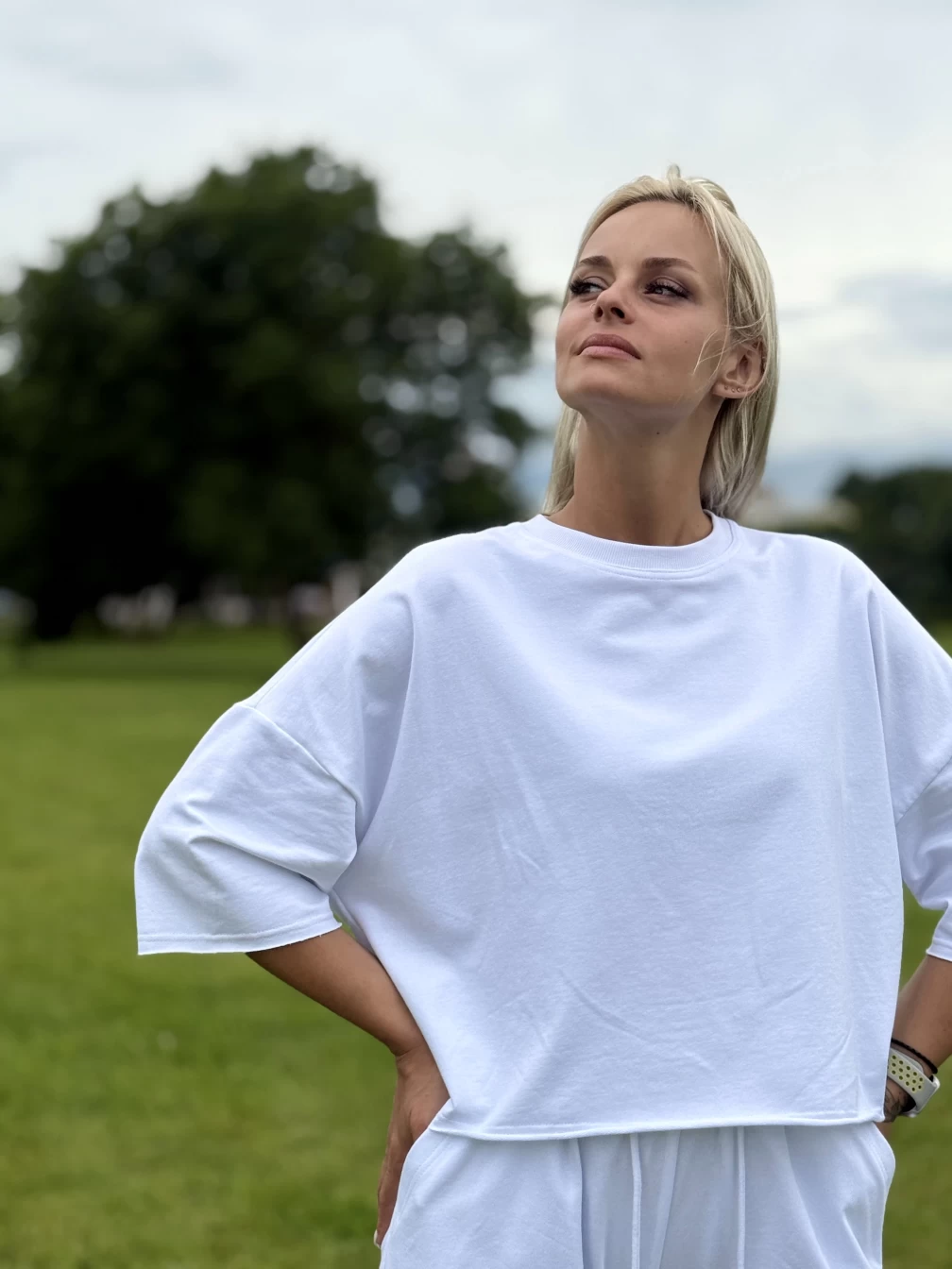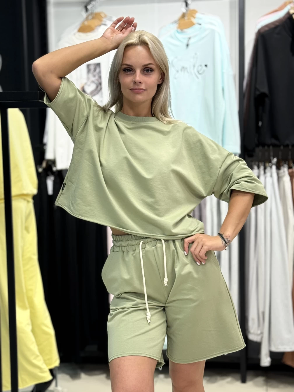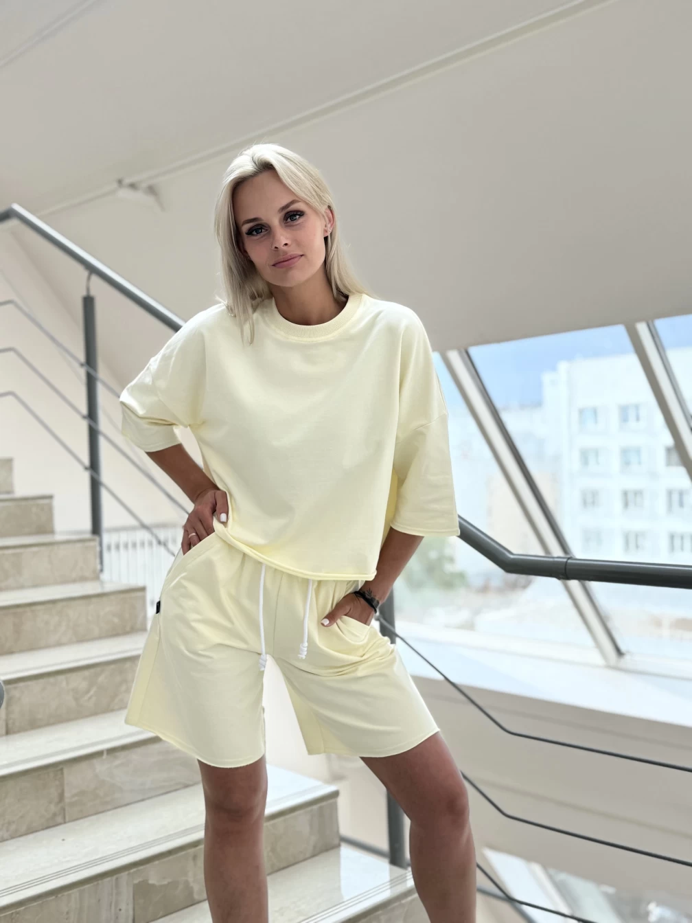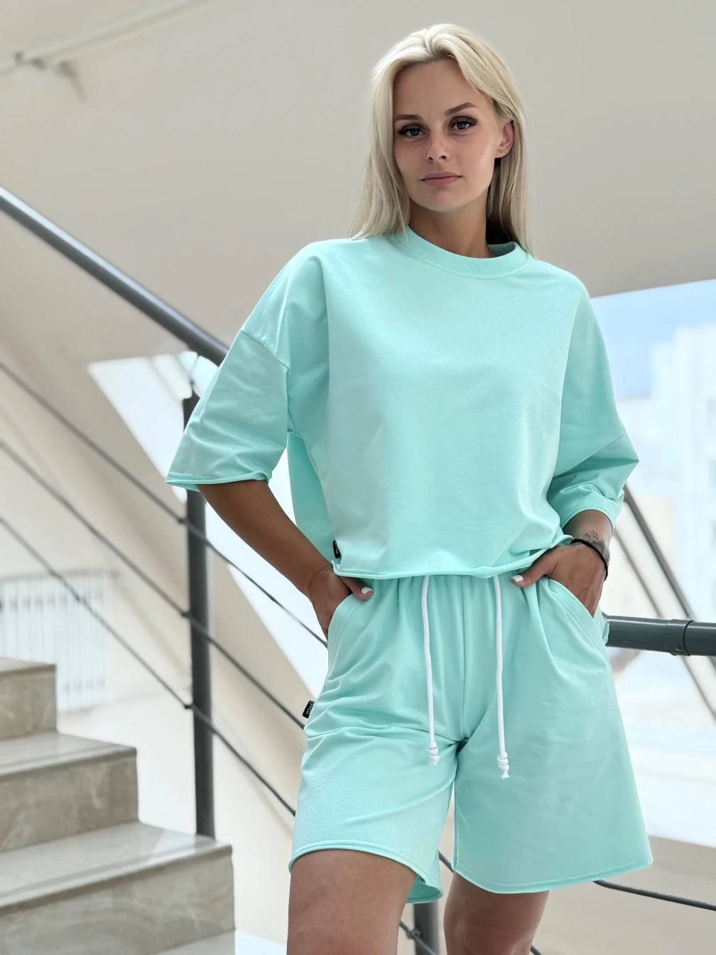 Современный трикотажный комплект, идеально подходящий для отдыха, прогулок и повседневной носки. В состав входит укороченная футболка в стиле оверсайз и шорты средней длины со свободной посадкой. Оба изделия выполнены в едином стиле и образуют гармоничный комплект. Футболка отличается спущенной линией плеча и сырым срезом по низу и рукавам, что придаёт образу расслабленность и актуальность. Горловина оформлена довязом, обеспечивающим аккуратную посадку и долговечность формы. Шорты дополнены эластичным поясом на резинке и регулирующим шнурком. Наличие боковых карманов делает модель удобной в повседневной носке. Сырой срез по низу шорт визуально перекликается с отделкой футболки и завершает целостный образ. Комплект не требует дополнительной стилизации и подходит для носки как дома, так и на улице.