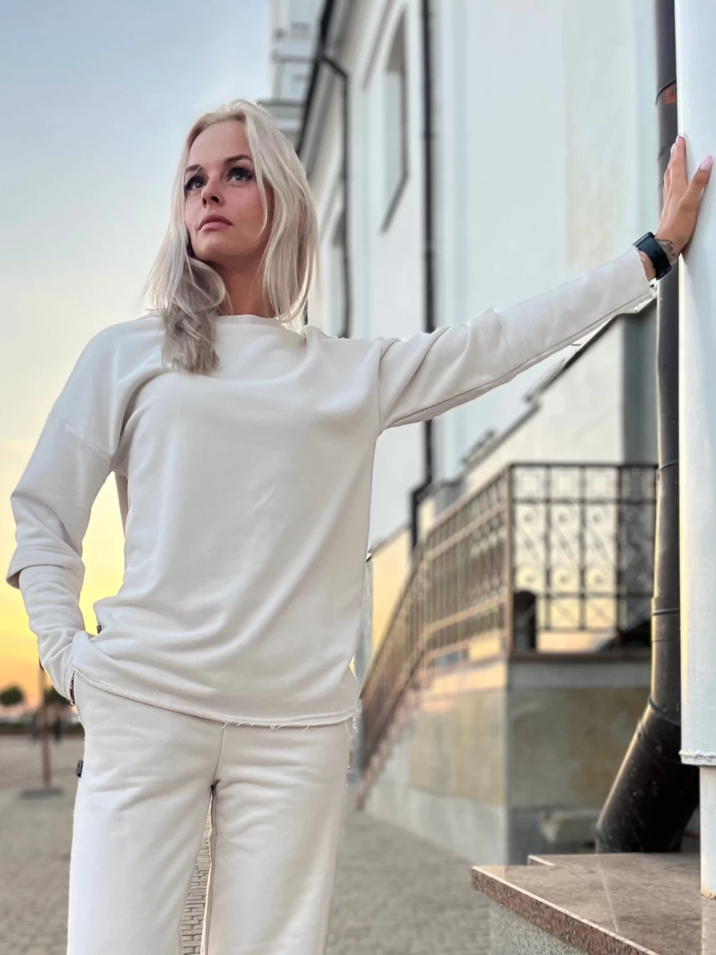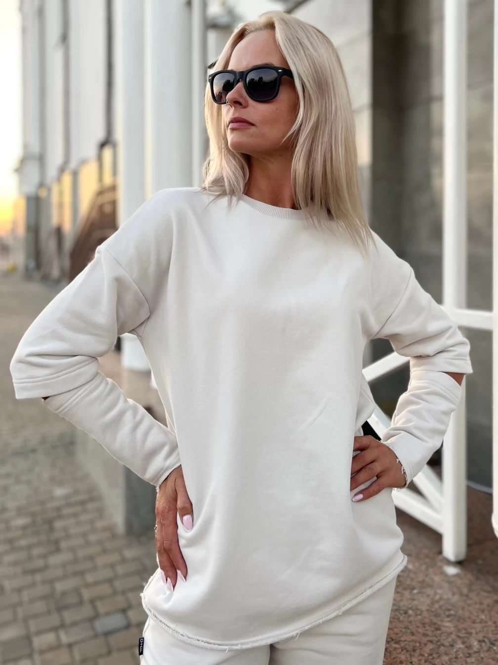 Особенностью модели являются сырой срез на рукавах и по низу изделия, что придает лонгсливу стильный, минималистичный вид и легкую небрежность.