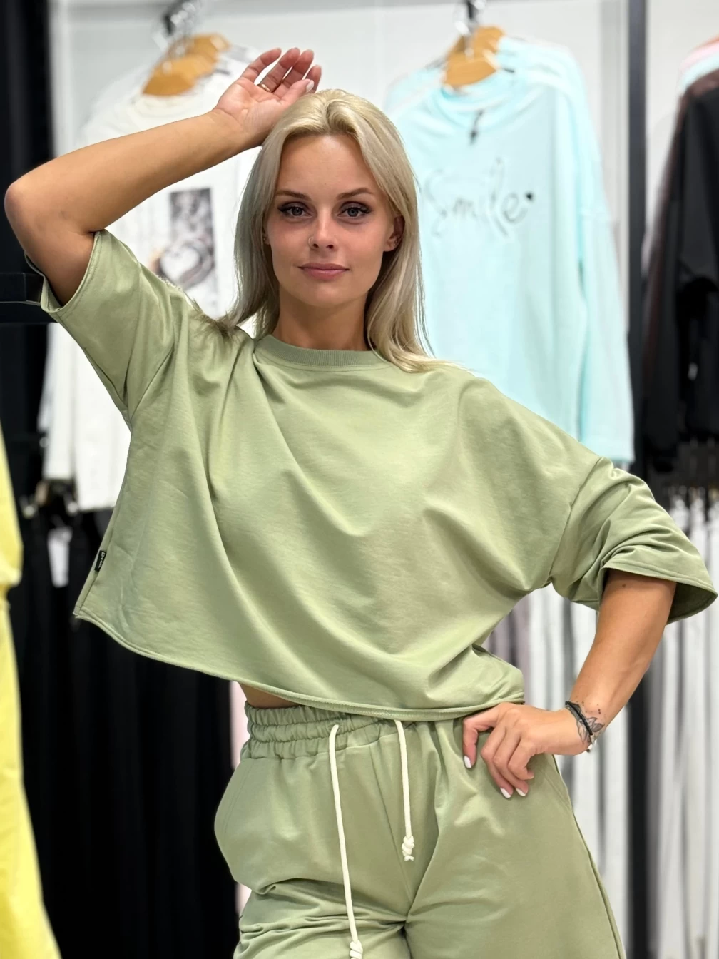Современная модель для повседневного гардероба. Футболка выполнена в стиле оверсайз со спущенной линией плеча, что обеспечивает комфортную посадку и создает расслабленный образ. Детали конструкции подчеркивают современный характер модели: горловина оформлена довязом, обеспечивающим форму и аккуратную посадку, а низ и рукава — с характерным сырым срезом без подгибки, что придает образу легкую небрежность и городской акцент.
