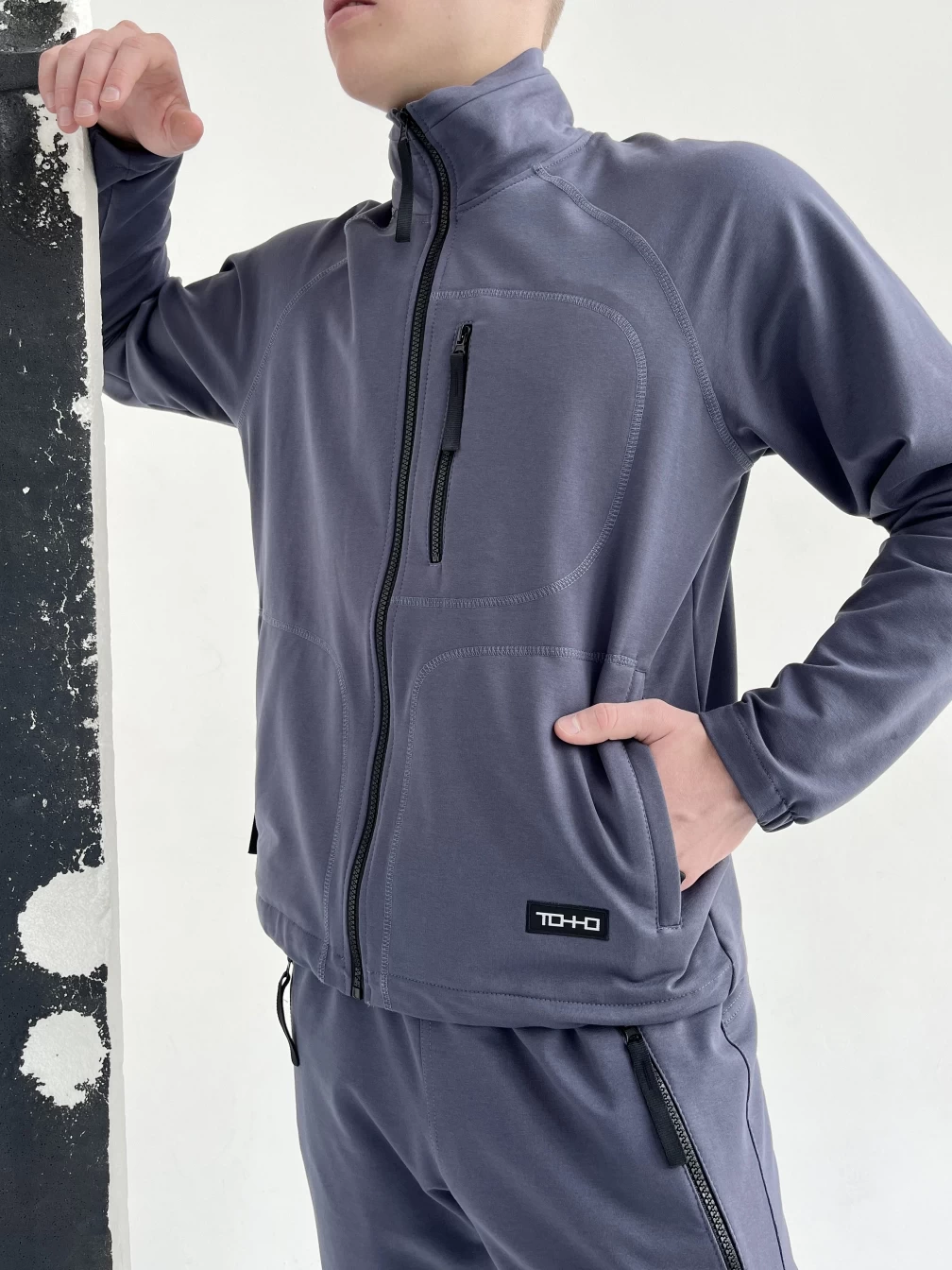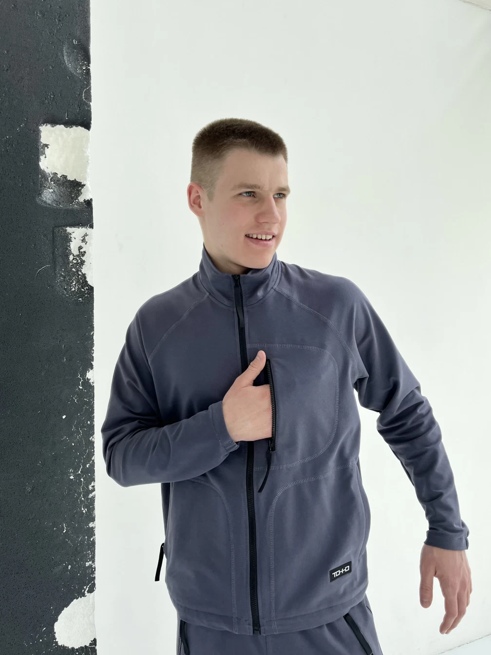 Представляем вам стильный и практичный костюм из двух вещей: толстовки на молнии с воротником-стойкой и удобных брюк на резинке.